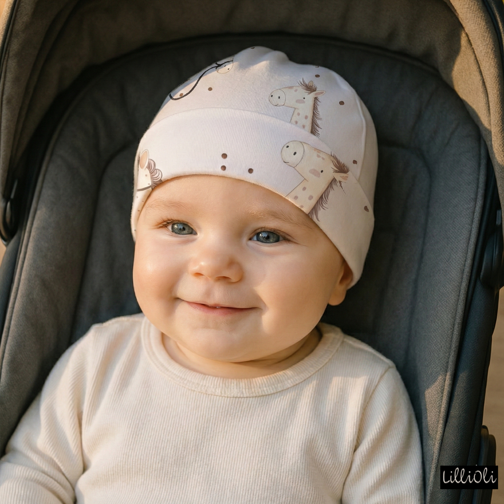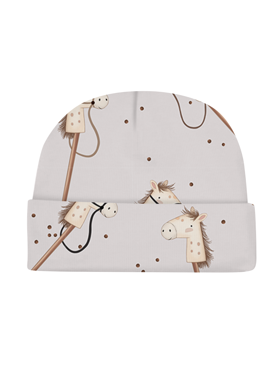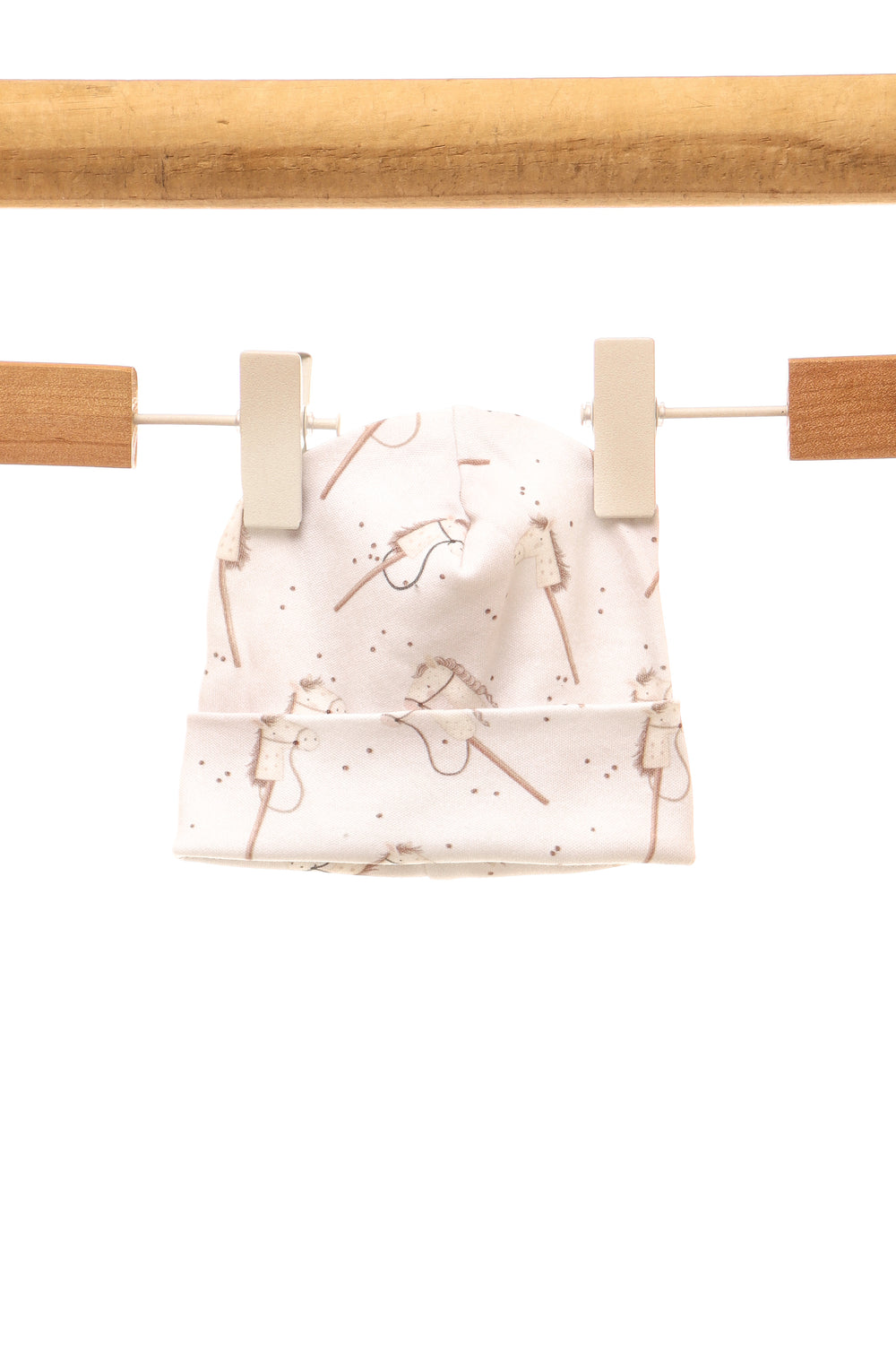 Fullfør antrekket med en lett lue i 100% Supima‑bomull, som viser sjarmerende kjepphester inspirert av tidløse nordiske leketøy, laget for å vekke fantasi og lekelyst.